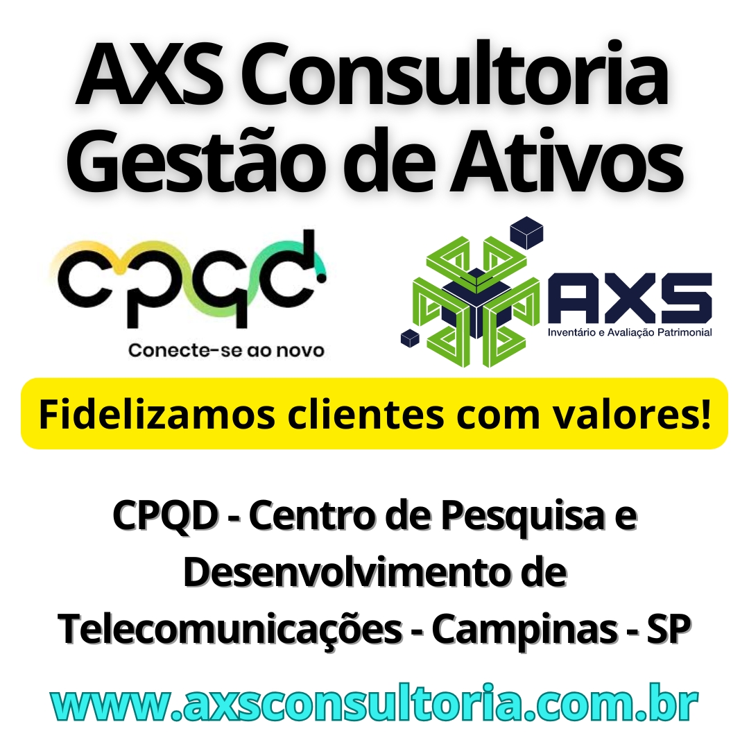 Um de nossos principais clientes, podemos chamar assim é o CPQD - Centro de Pesquisa e Desenvolvimento em Telecomunicações que está localizado no município de Campinas interior de São Paulo, uma empresa com foco na Governança Corporativa, esse é um parque tecnológico composto por diversos ativos e que presa pela precisão de suas informações, tanto patrimoniais, quanto informações tecnológicas que são desenvolvidas para seus clientes, assim a AXS Consultoria foi contratada para a realização do levantamento patrimonial do CPQD pela terceira vez, isso demonstra que a contratação e a entrega dos trabalhos atenderam as expectativas da empresa, e o importante é que todo o trabalho realizado anteriormente foi validado pelo corpo de gestão da empresa, analistas, contadores e diretores e também validado pela empresa de auditoria contratada, que é classificada como BIG4, isso somente consolidada a importância da contratação de uma consultoria especializada, que de fato atenda às necessidades do cliente.