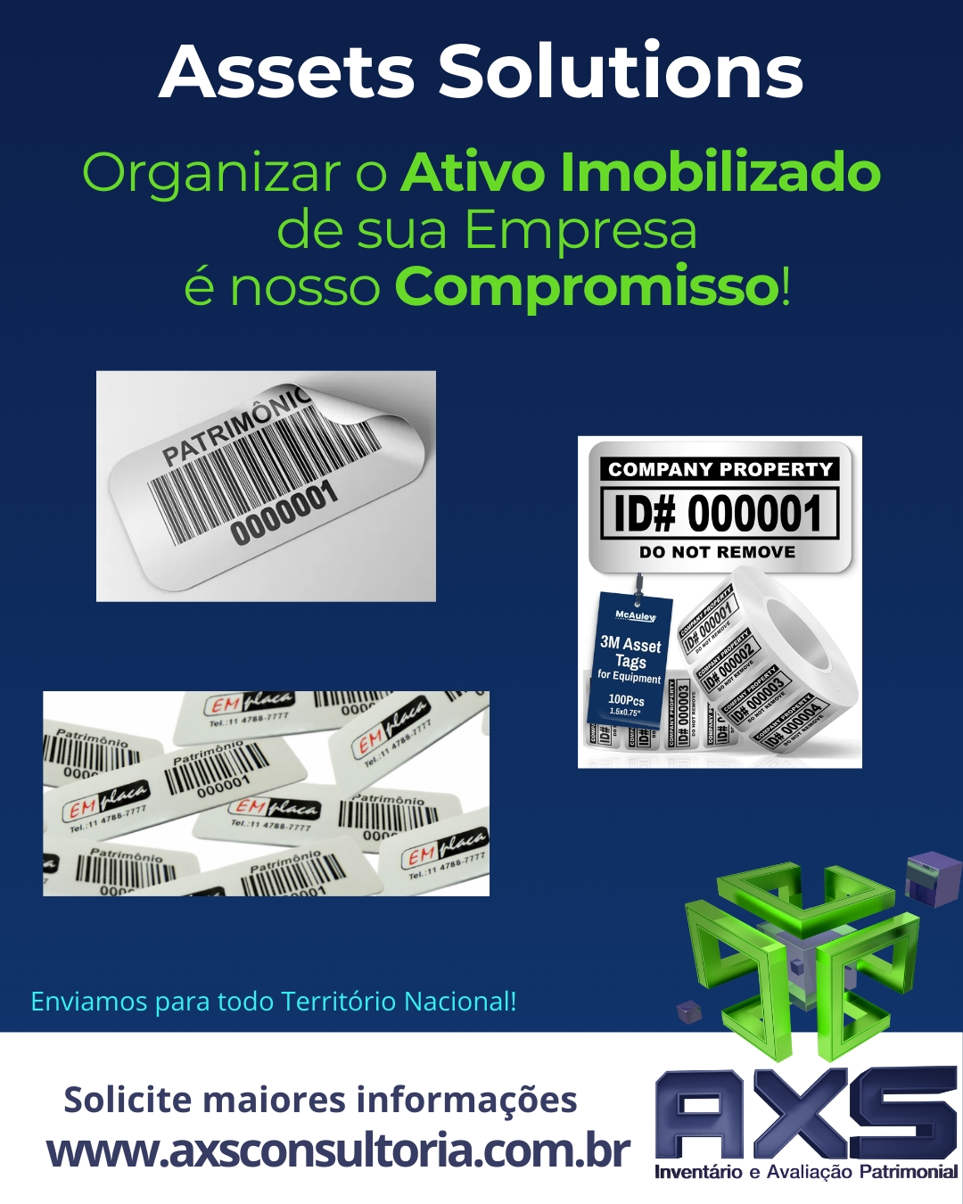 Quando o assunto é Ativo Imobilizado, não há espaço para improvisos. A correta identificação, controle, rastreabilidade e organização patrimonial são fatores decisivos para a governança corporativa, para a confiabilidade das informações contábeis e para a segurança operacional das empresas. É nesse contexto que a AXS Consultoria Empresarial se consolida como um verdadeiro hub especializado em soluções patrimoniais, reunindo conhecimento técnico, tecnologia e produtos de alta qualidade voltados exclusivamente à gestão do ativo imobilizado.