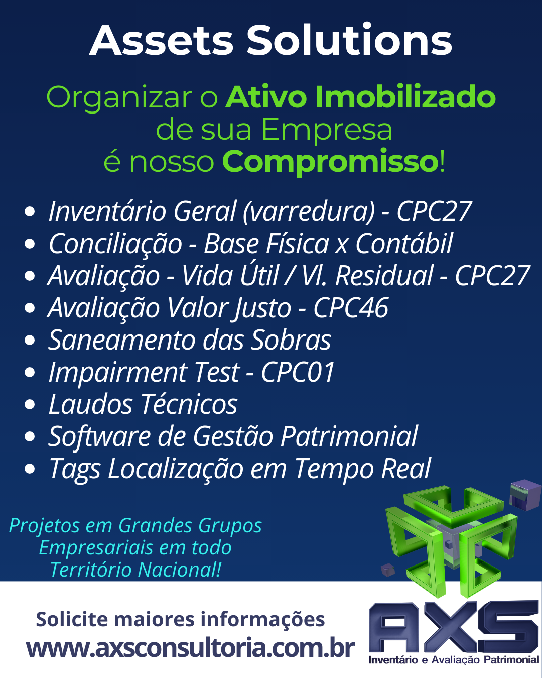 Com essa nova tecnologia, a AXS se posiciona como uma Asset Management Solution Provider, indo além do inventário tradicional. A empresa entrega uma solução que conecta inventário, avaliação, rastreamento e gestão digital, alinhada às melhores práticas de asset governance.