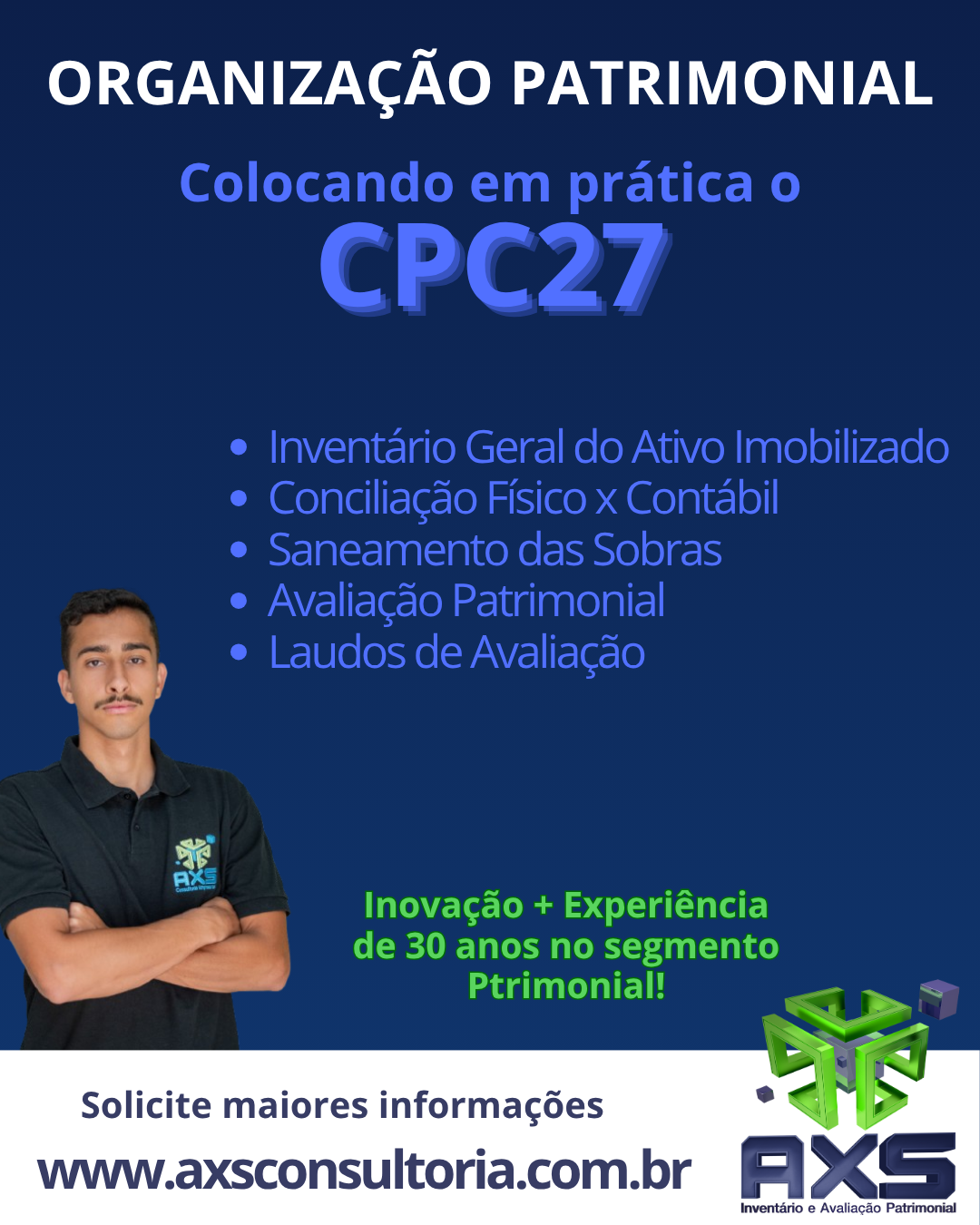A AXS Consultoria Empresarial entende que a gestão de ativos é uma ferramenta estratégica. Com uma metodologia que segue rigorosamente as normas mais exigentes (CPC 27, ISO 55001 e ABNT), a AXS oferece soluções personalizadas para empresas de qualquer porte ou segmento.
